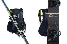 - Securely attach skis with diagonal carry or a snowboard with vertical carry